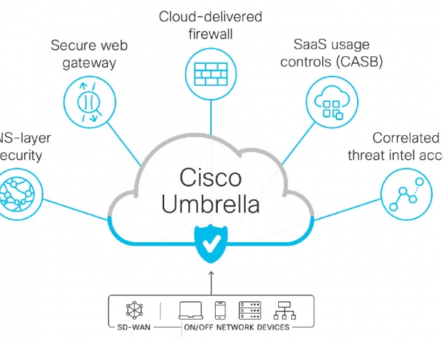 Cisco Umbrella - chmurowa usługa bezpieczeństwa, która zapewnia pierwszą linię obrony przed zagrożeniami internetowymi dzięki ochronie na warstwie DNS, filtrowaniu ruchu i globalnej inteligencji zagrożeń.