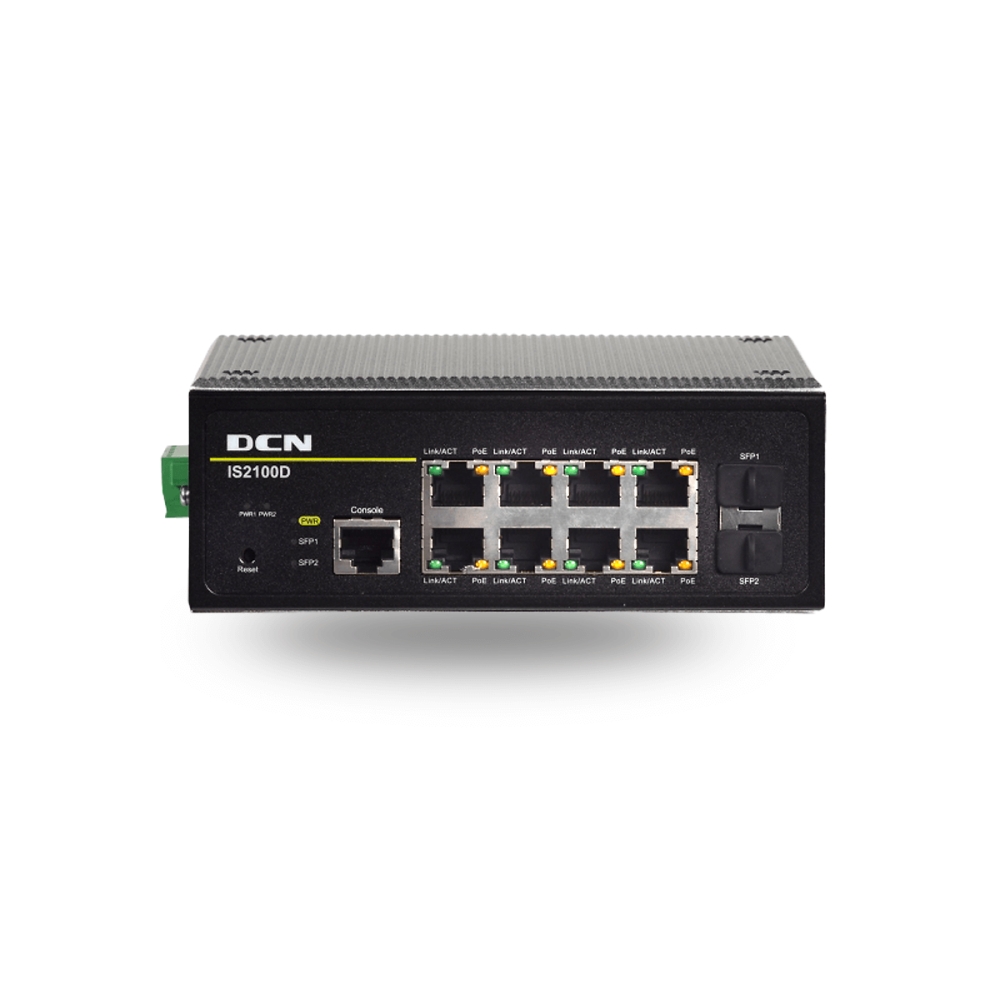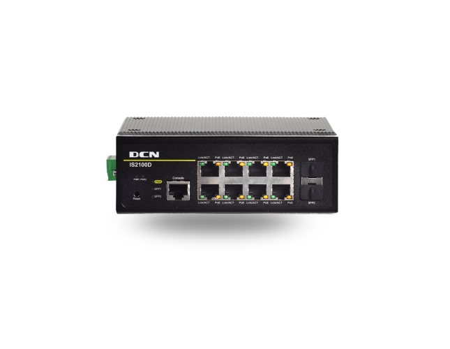 Seria DCN IS2100 to przemysłowe przełączniki L2 w formacie DIN-rail, zaprojektowane do pracy w ekstremalnych warunkach temperaturowych. Wersje z portami PoE+ (IS2100D-2GF8TX-P, IS2100D-2GF8GT-P) umożliwiają zasilanie urządzeń końcowych, podczas gdy IS2100D-2GF8TX-P to opcja podstawowa bez PoE.