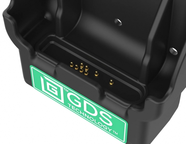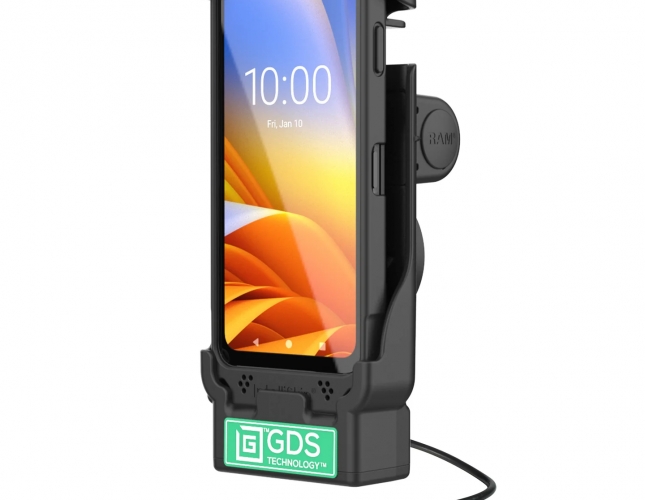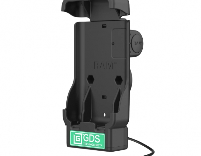Stacja dokująca GDS firmy RAM Mounts z technologią IntelliSkin (RAM-GDS-DOCK-ZE38-A-PU). Przeznaczona jest do pojazdów w celu przeyłania danych i szybkiego łądowania urządzeń moblinych Zebra EM45/EM45 RFID.