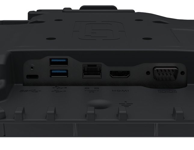 Rozbudowana replikacja portów – HDMI, port szeregowy RS-232, Ethernet RJ-45, USB-A i USB-C (zarówno w standardzie 2.0, jak i 3.0), złącze zasilania 19 V oraz opcjonalne wejście Quad RF (SMA) dla anten zewnętrznych (GPS, LTE/5G, Wi-Fi).