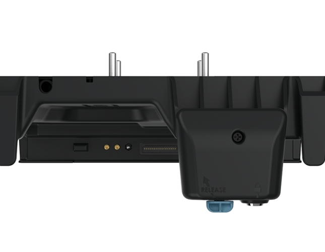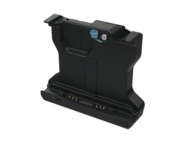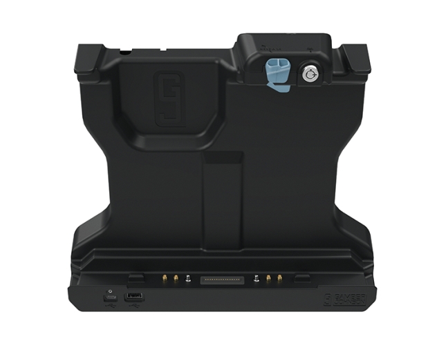 Uchwyt dokujący jest dedykowany tabletowi Getac F120. Zapewnia stabilne i szybkie dokowanie, bezpieczne ładowanie oraz stałe połączenie z aparaturą peryferyjną, zwiększając produktywność i funkcjonalność mobilnego stanowiska pracy. Kompaktowy format oraz konstrukcja kompatybilna z systemami montażowymi Gamber‑Johnson umożliwia wygodną integrację w kokpicie, bez nadmiernego zajmowania przestrzeni oraz z zachowaniem ergonomii pracy.