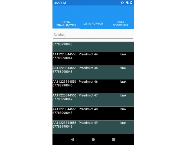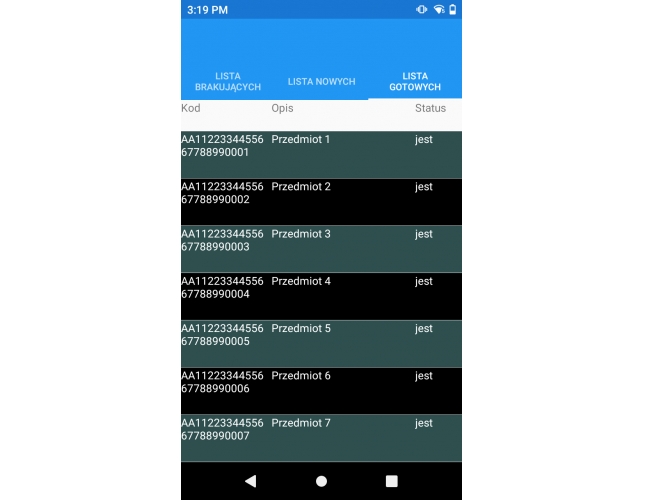 System składa się z aplikacji mobilnej, działającej na ręcznym terminalu danych wyposażonym w czytnik RFID i/lub skaner kodów.