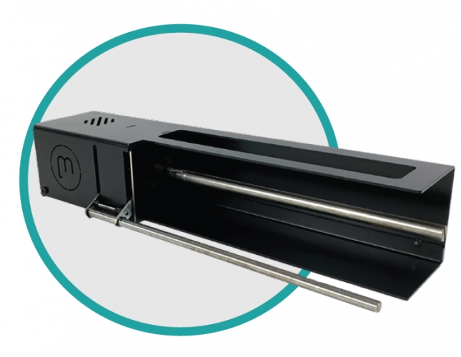 MC-65-PE jest umieszczany przed drukarką i nawija papier podkładowy z etykiet. Dzięki temu zapewnia bezpieczeństwo i czystość podgłogi roboczej.