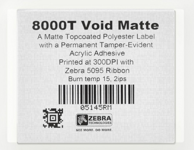 Specjalna etykieta syntetyczna 8000T Void Matte to etykieta termotransferowa z matowego, srebrnego poliestru z klejem zabezpieczającym przed modyfikacjami.