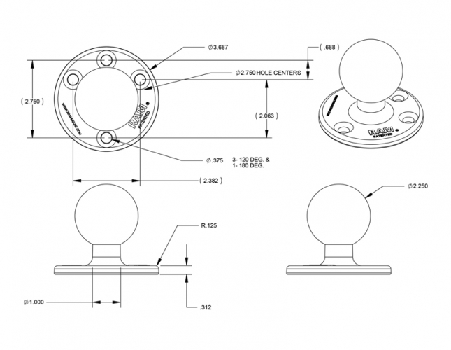 Gumowa kula montażowa RAM o średnicy 2.25 cala (PN RAM-D-202U) połączona z płaską okrągłą podstawą o średnicy 3.68 cala. Podstawa posiada nawiercony uniwersalny układ otworów AMPS.