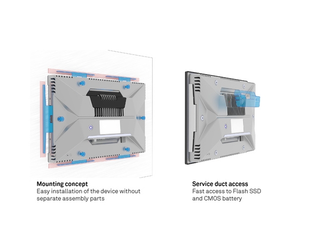 Innowacyjna koncepcja montażu serii OPC9000 umożliwia łatwą instalację urządzenia bez oddzielnych części montażowych. Ze względu na specyficzny kształt elementów montażowych, Panel PC jest dociskany liniowo do ściany instalacyjnej sposób, który zapewnia optymalne bezpieczeństwo i równomierne rozłożenie ciężaru na ścianie instalacyjnej. Dostęp do tylnego kanału serwisowego zapewnia szybki dostęp do pamięci Flash SSD i baterii CMOS.