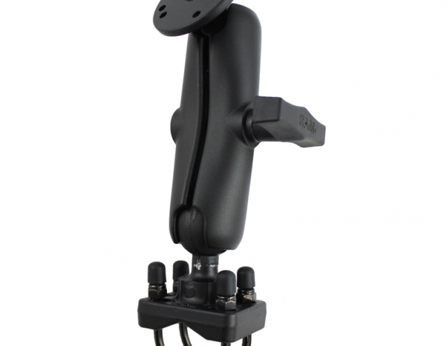 Zawiera podwójną podstawę ze śrubą w kształcie litery U, która mieści szyny o średnicy od 1,25" do 1,5" i średniej długości ramię z podwójnym gniazdem RAM w rozmiarze C.