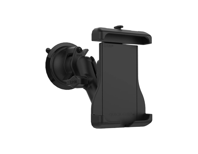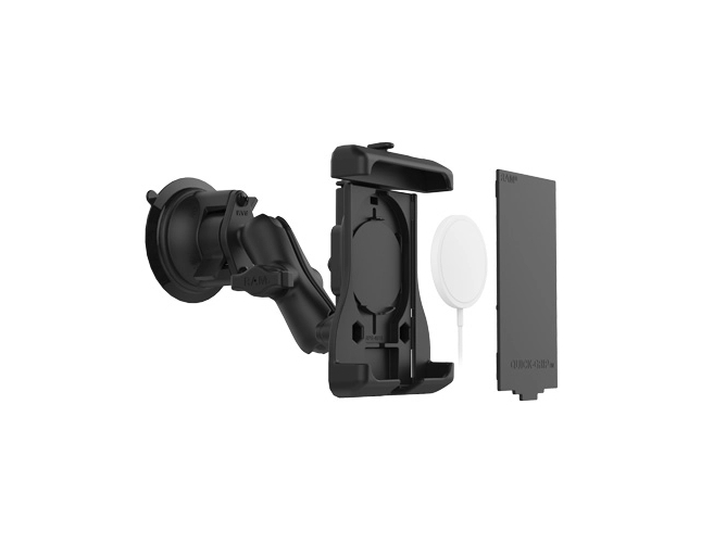 Uchwyt z przyssawką Quick -Grip RAM Mounts do telefonów Apple iPhone (PN: RAM-B-166-UN15WU), zaprojektowany specjalnie, aby pasował do oficjalnej ładowarki Apple MagSafe.