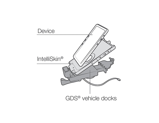 Dolna miska dokująca zawiera 8 pinów pogo i złącze USB Type-C. Bez konieczności zdejmowania pokrowca IntelliSkin z urządzenia, możliwe jest sprawne zamontowanie tabletu w samochodowej stacji dokującej, żeby został naładowany i zablokowany.