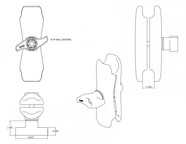 Ramię RAM z podwójnym gniazdem rozmiar C (PN RAM-D-201U) zapewnia całkowitą długość 8.44" i długość między gniazdami 6.88".