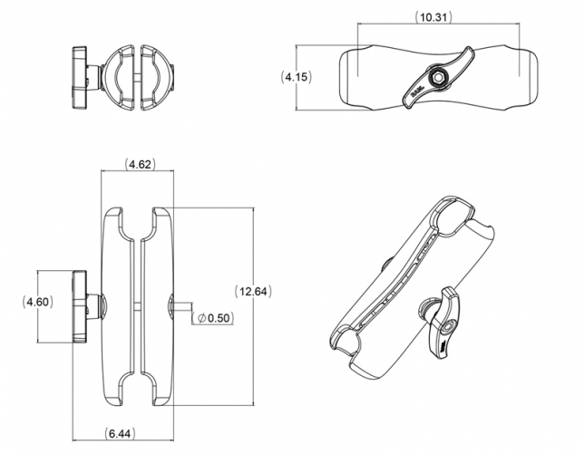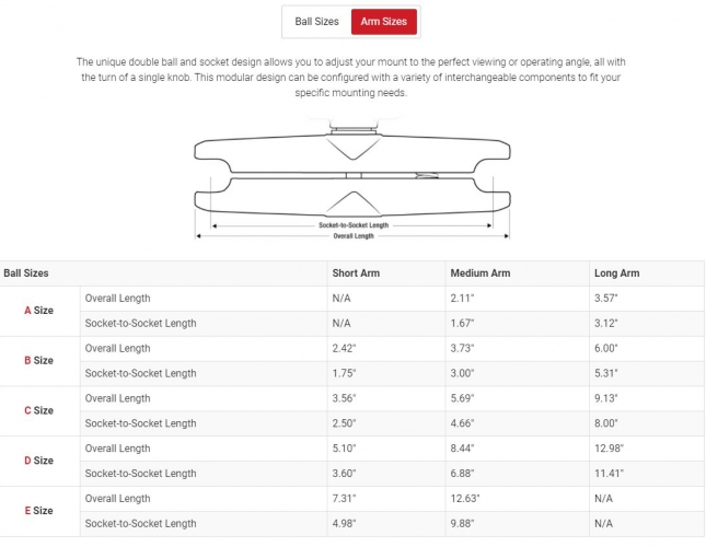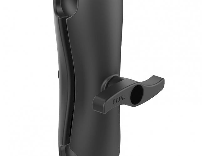 Ramię RAM z podwójnym gniazdem rozmiar E (PN RAM-E-201U) zapewnia całkowitą długość 12.625" i mieści kule montażowe 3.38". Pojedyncza sprężyna wewnątrz ramienia otwiera gniazda końcowe, umożliwiając obrót połączenia kulowego i tym samym szeroki zakres regulacji.
