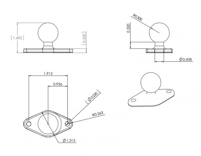 Uchwyt RAM w kształcie rombu (PN RAM-B-238U) o wymiarach 2,43" x 1,31" z kulą montażową 1". Jest kompatybilny z kilkoma uchwytami i podstawkami na urządzenia RAM.