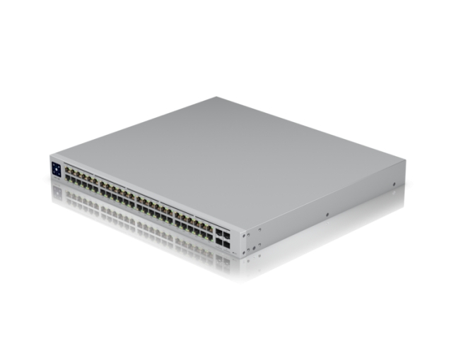 Ubiquiti UniFi Pro 48 PoE (USW‑Pro‑48‑PoE) to zaawansowany switch sieciowy warstwy 3, oferujący 48 portów Gigabit Ethernet z obsługą PoE+ i PoE++, idealny do wymagających wdrożeń sieciowych.