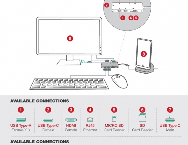 Ten wytrzymały hub nadaje się do podłączenia telefonu, tabletu, akcesoriów i urządzeń peryferyjnych, takie jak mysz, klawiatura lub adapter wyjścia ekranu HDMI. Złącze typu pigtail USB typu C jest kompatybilne z większością telefonów i tabletów typu C, a wyjście HDMI obsługuje zarówno Samsung DeX, jak i funkcję dublowania ekranu.