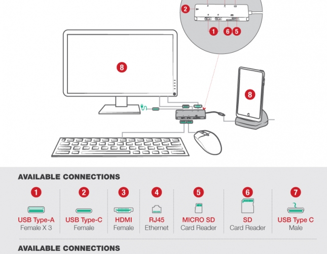 Idealny do niemal każdego środowiska biurowego, ten uniwersalny koncentrator USB typu C umożliwia podłączenie wielu wejść i wyjść do szerokiej gamy urządzeń. Ten wytrzymały hub nadaje się do podłączenia telefonu, tabletu, akcesoriów i urządzeń peryferyjnych, takich jak mysz, klawiatura, karta SD lub adapter wyjścia ekranu HDMI. Złącze typu pigtail USB typu C jest kompatybilne z większością telefonów i tabletów typu C, a wyjście HDMI obsługuje zarówno Samsung DeX, jak i funkcję dublowania ekranu.