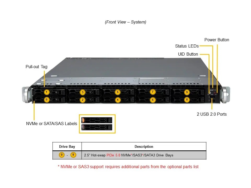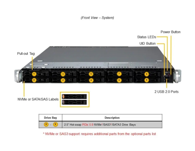 - 10× 2,5" hot-swap NVMe/SAS/SATA + 2× M.2 PCIe 3.0