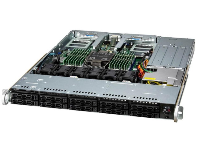 Supermicro UP SuperServer SYS-111C-NR to jednoprocesorowy serwer w formacie 1U, zaprojektowany z myślą o środowiskach chmurowych, wirtualizacji i obliczeń brzegowych. Obsługuje procesory Intel Xeon Scalable 4. i 5. generacji z gniazdem LGA-4677 oraz oferuje 10 zatok na dyski 2,5" hot-swap z obsługą NVMe, SAS i SATA.