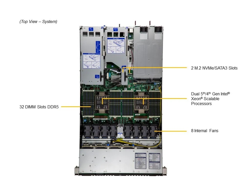 - 2 procesory Intel Xeon Scalable 5./4. gen. – wsparcie dla Intel Xeon CPU Max Series z pamięcią HBM