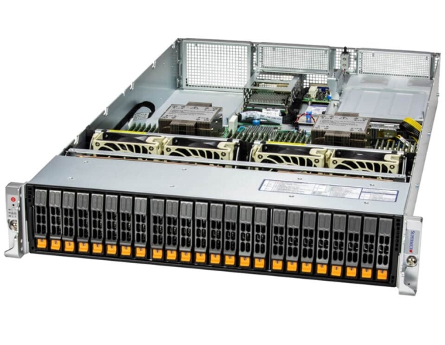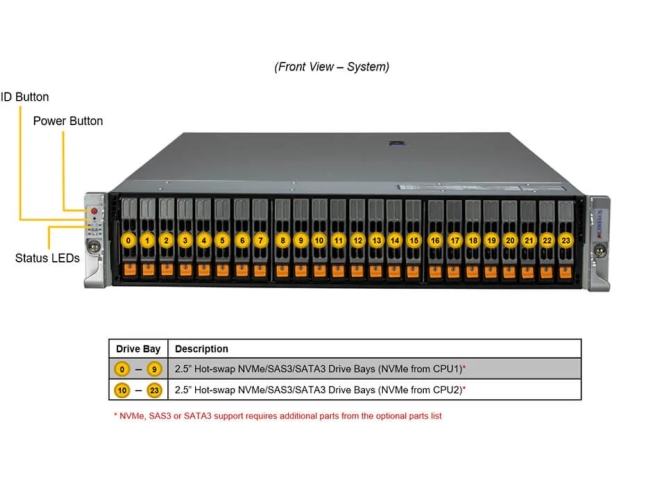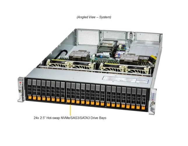 - 24× 2,5" hot-swap NVMe/SAS/SATA + 2× M.2 NVMe/SATA