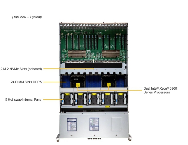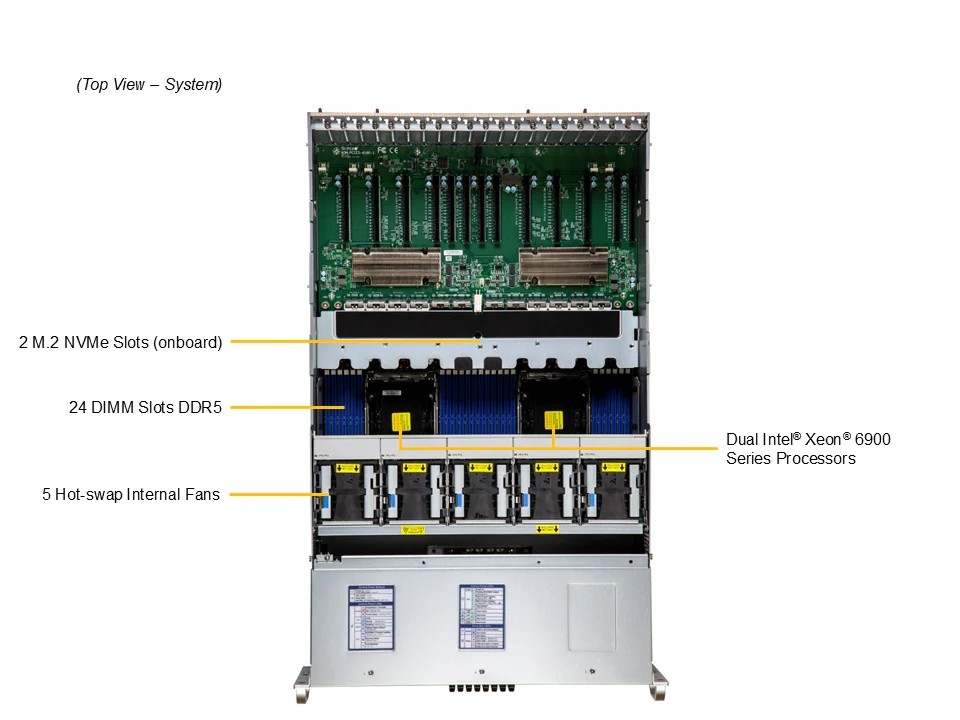 Supermicro GPU SuperServer SYS-422GA-NRT to dwuprocesorowy system 4U z architekturą Dual-Root PCIe, zaprojektowany specjalnie do intensywnych obciążeń GPU. Obsługuje do 8 kart GPU podwójnej szerokości o mocy 600W każda, w tym NVIDIA H200 NVL i RTX PRO 6000 Blackwell. Bazuje na najnowszych procesorach Intel Xeon 6900 z P-cores.