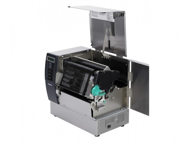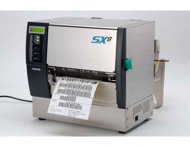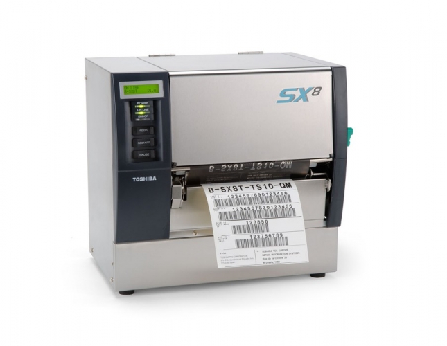 Toshiba B-SX8T to drukarka przemysłowa umożliwiająca wydruk etykiet do 213 mm szerokości.
