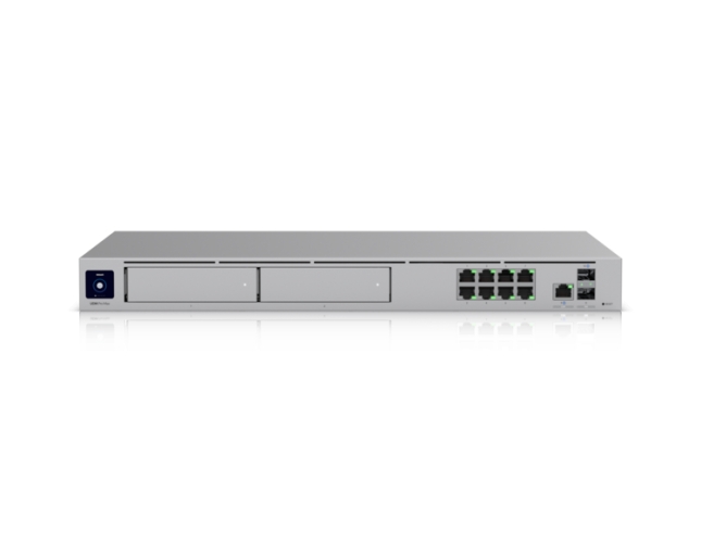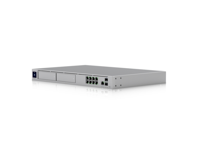 Kontroler Dream Machine Pro Max oferuje wielobandowe łącza: port 2,5 GbE RJ‑45 oraz dwa porty 10 Gb SFP+, umożliwiając szybkie i elastyczne połączenia sieciowe. Wydajność zabezpieczeń z włączonym IDS/IPS osiąga do 5 Gb/s, wspierając pełny firewall warstwy 7, DPI, filtrowanie treści, VPN i SD‑WAN. Urządzenie posiada dwie zatoki na dyski (3,5″) oraz fabrycznie wbudowany 128 GB SSD, umożliwiając lokalne przechowywanie nagrań NVR i konfigurację RAID 1 zapewniającą bezpieczeństwo danych.