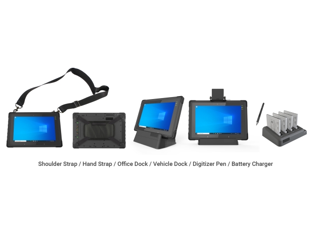 Tablet TB170 można nosić na pasku na ramię lub na rękę. Dostępne są też stacje dokujące dla mobilnego biura lub do pojazdów.