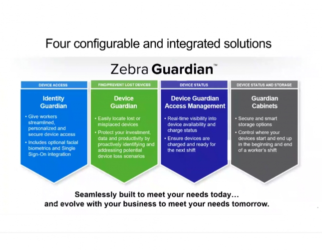 Zebra Guardian to konfigurowalne i zintegrowane portfolio kompleksowych rozwiązań dostępu do urządzeń, które można nakładać warstwami, aby osiągnąć poziom kontroli dostępu, rozliczalności urządzeń, odzyskiwania urządzeń i dostępności sprzętu, za pomocą kilku praktycznych narzędzi. Rozwiązanie powstało z myślą o pracownikach pierwszej linii, aby: